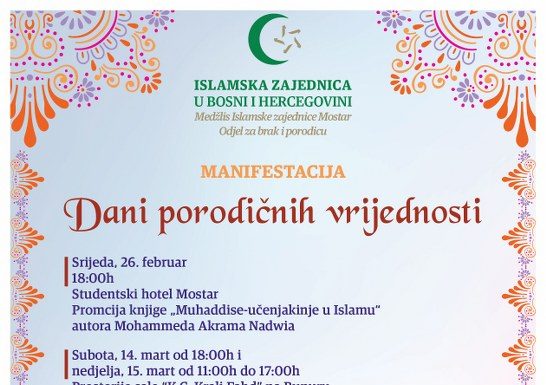 Odjel za brak i porodicu Medžlisa Islamske zajednice Mostar organizuje jednomjesečnu manifestaciju „Dani porodičnih vrijednosti.“ Manifestacija će trajati od 26.02.do 30.03.2020. Cilj ove manifestacije je afirmacija skladnog, urednog, harmoničnog bračnog i porodičnog života. „Osim vjere koja daje smisao...