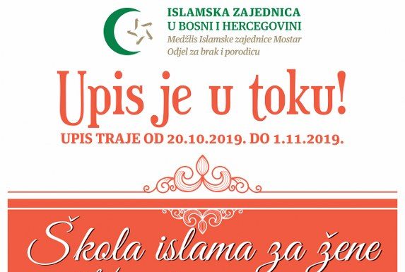 Odjel za brak i porodicu Medžlisa Islamske zajednice Mostar poziva sve zainteresirane da se prijeve u novi ciklus nastave Škole islama za žene. Upis traje od 20.10. do 1.11. 2019.godine.