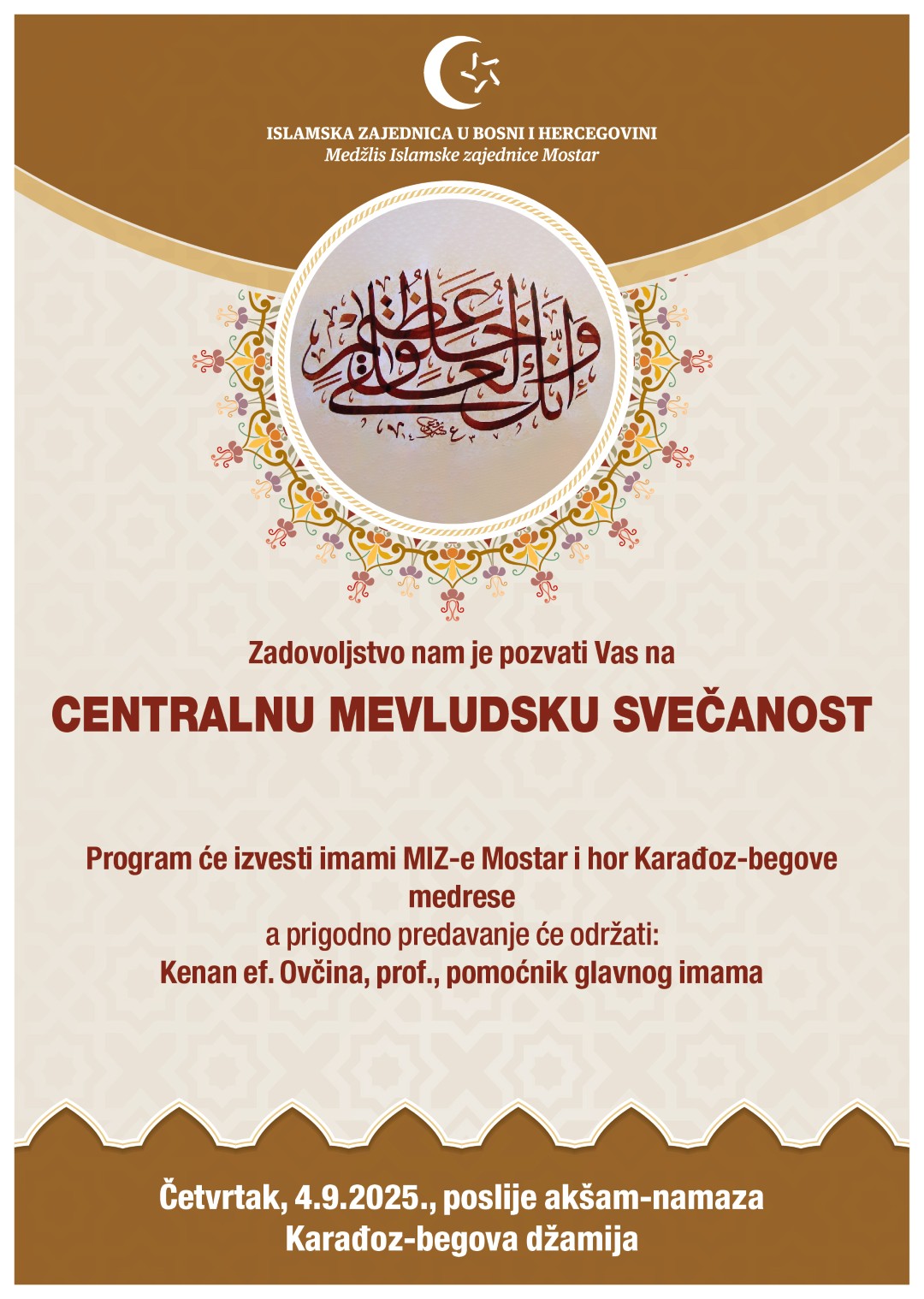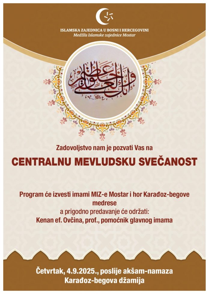 Medžlis Islamske zajednice Mostar centralnu mevludsku svečanost u povodu obilježavanja 12. rebiul-evvela, datuma rođenja posljednjeg Božijeg Poslanika Muhameda a.s. organizirat će večeras u Karađoz-begovoj džamiji.