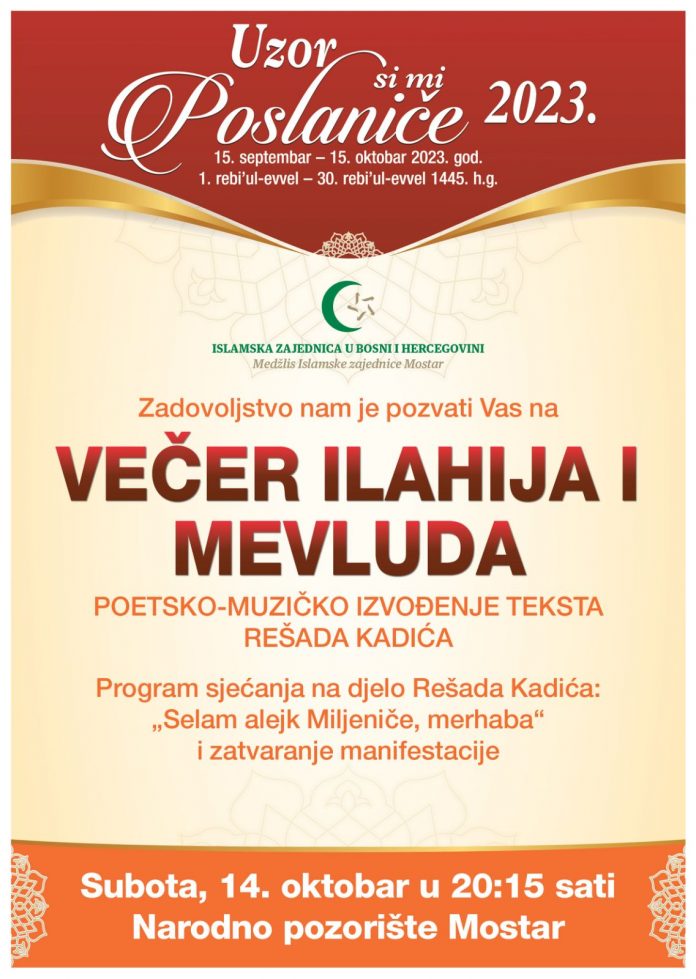Medžlis Islamske zajednice Mostar ovogodišnju manifestaciju „Uzor si mi, Poslaniče“, posvećenu obilježavanju mjeseca rođenja Muhameda a.s., zvanično će zatvoriti poetsko muzičkim izvođenjem teksta mevluda Rešada Kadića. Program će izvesti imami Medžlisa IZ-e Mostar, učenici Karađoz-begove medrese, aktivisti Info serivisa za mlade i Mreže mladih MIZ Mostar. Ovaj jedinstven muzičko scenski program nazvan je po jednom od stihova iz Kadićevog spjeva „Selam alejk Miljeniče, merhaba”.