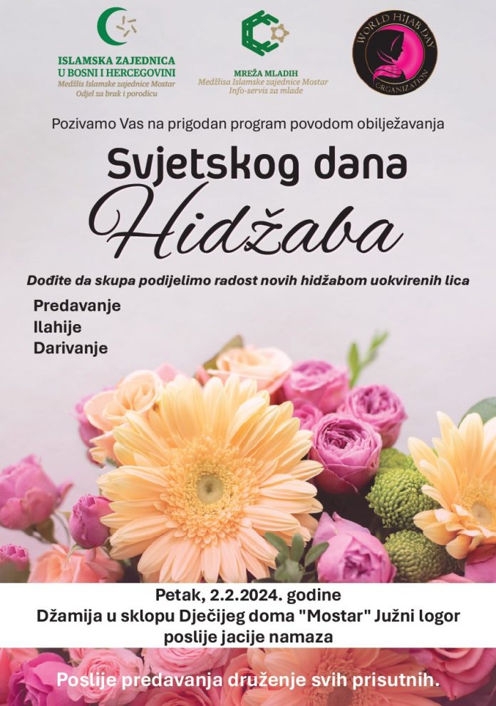 Start Istaknuto Svjetski dan hidžaba u programima Odjela za brak i porodicu i Info... IstaknutoNajave Svjetski dan hidžaba u programima Odjela za brak i porodicu i Info servisa za mlade Autor Medžlis Mostar - 01.02.2024. 628 Medžlis Islamske zajednice Mostar; Odjel za brak i porodicu i Info-servis za mlade zajedničkom programom obilježit će svjetski dan hidžaba. Program će se održati u petak (2.2.2024. godine) u džamiji Dječijeg doma (Južni logor) poslije jacije namaza. POVEZANI ČLANCIOSTALE VIJESTI AUTORA Istaknuto Javni poziv za provjeru legalnosti svih javnih, vjerskih i kulturnih građevina, spomenika i vjerskih simbola na javnim površinama Istaknuto Lakišića harem – ispit savjesti bošnjačkih institucija Istaknuto Bez najave i obrazloženja: Betonski križevi u haremu Kantarevac otvorili brojna pitanja - Advertisement - POPULARNO Kenan ef. Ovčina za Oslobođenje: Dobra djela treba činiti i nakon... 23.03.2026. Hadžije s područja Mostarskog Muftijstva od 1994 do 2016 08.09.2015. Posjeta Odjelu za ginekologiju i akušerstvo, darivanje prve bebe u 1447.... 27.06.2025. Bez najave i obrazloženja: Betonski križevi u haremu Kantarevac otvorili brojna... 25.03.2026. Učitaj više NAJNOVIJE VIJESTI Istaknuto Javni poziv za provjeru legalnosti svih javnih, vjerskih i kulturnih građevina,... Istaknuto Lakišića harem – ispit savjesti bošnjačkih institucija Istaknuto Bez najave i obrazloženja: Betonski križevi u haremu Kantarevac otvorili brojna... Istaknuto Kenan ef. Ovčina za Oslobođenje: Dobra djela treba činiti i nakon...