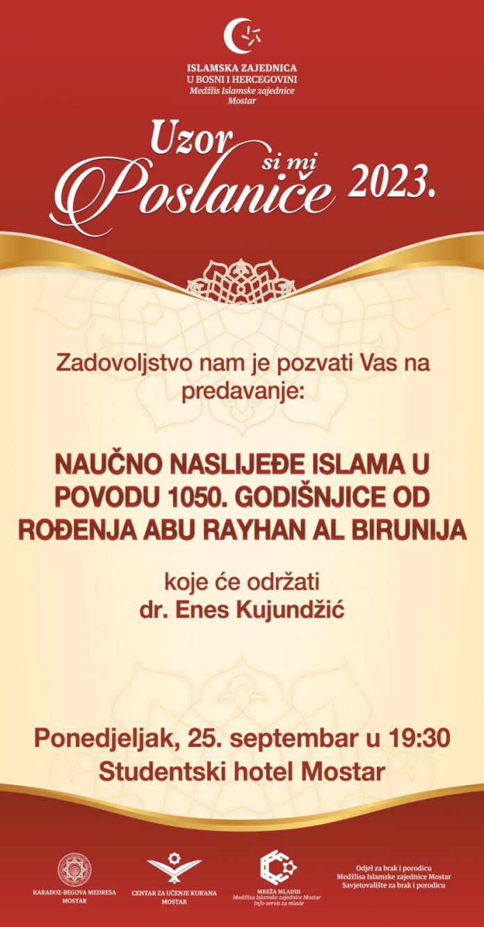 U okviru manifestacije „Uzor si mi, Poslaniče“ večeras će biti upriličena predavanje o naučnom naslijeđu islama u povodu 1050. godišnjice od rođenja Abu Rayhan al-Birunija. O ovoj temi će govoriti dr. Enes Kujundžić. Tribina će se održati u Studentskom hotelu Mostar u 19:30.